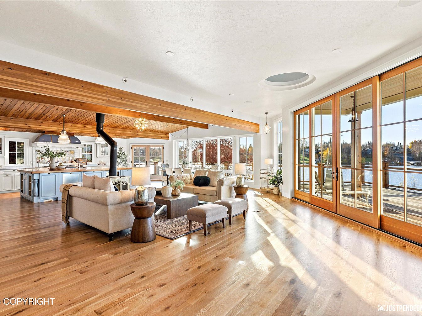 This expansive open living area seamlessly blends comfort and elegance. Natural light floods the space through large windows, highlighting the rich wooden beams and stunning hardwood floors. A cozy beige sofa faces a stylish coffee table adorned with tasteful decor, creating an inviting atmosphere for family gatherings. The subtle color palette features soft neutrals complemented by blue accents in the kitchen cabinetry, adding a contemporary touch. The architectural details, including modern light fixtures and plush seating, enhance the room’s warmth and functionality. This family-friendly layout encourages both relaxation and social interaction, making it perfect for everyday living.