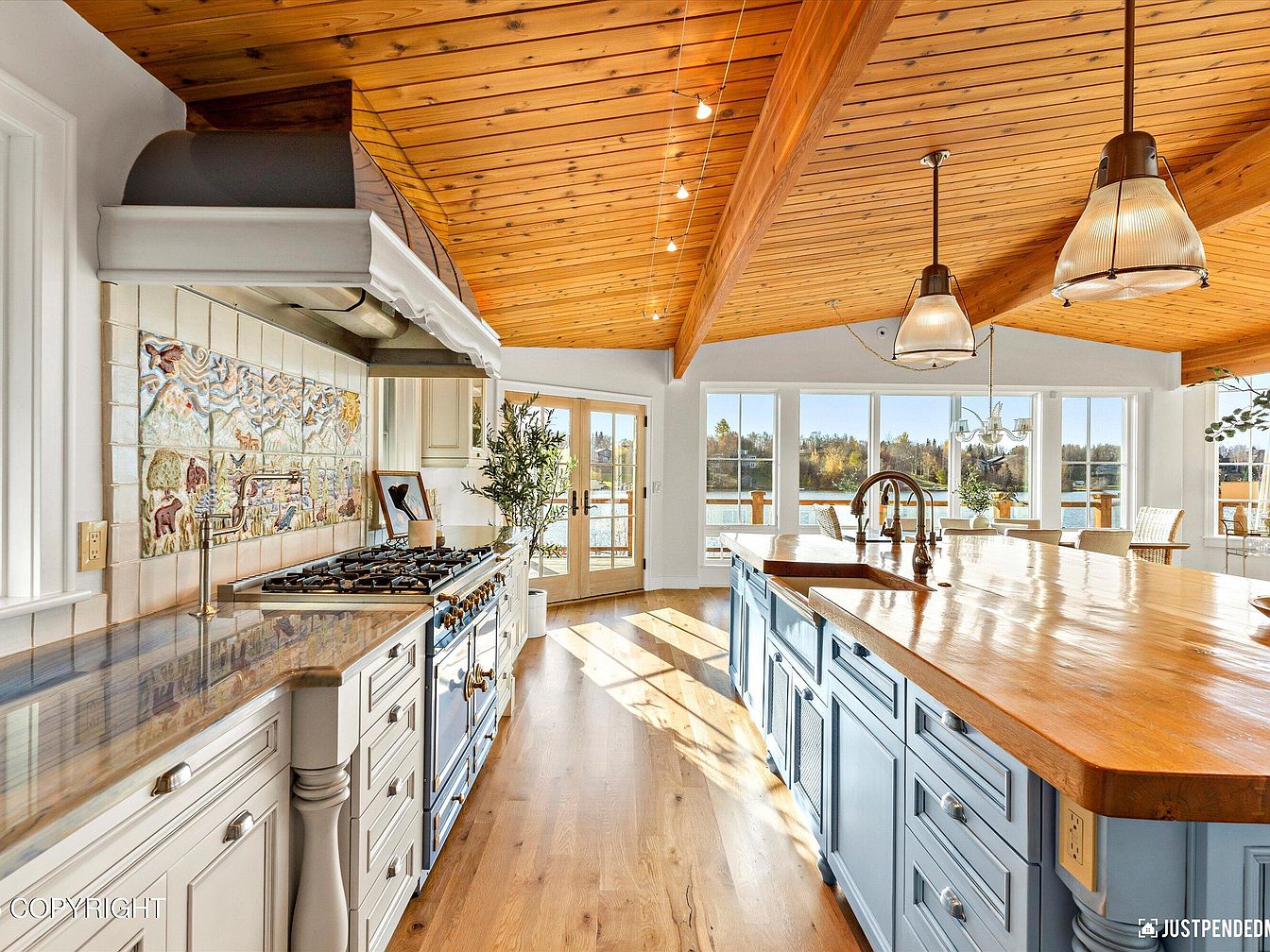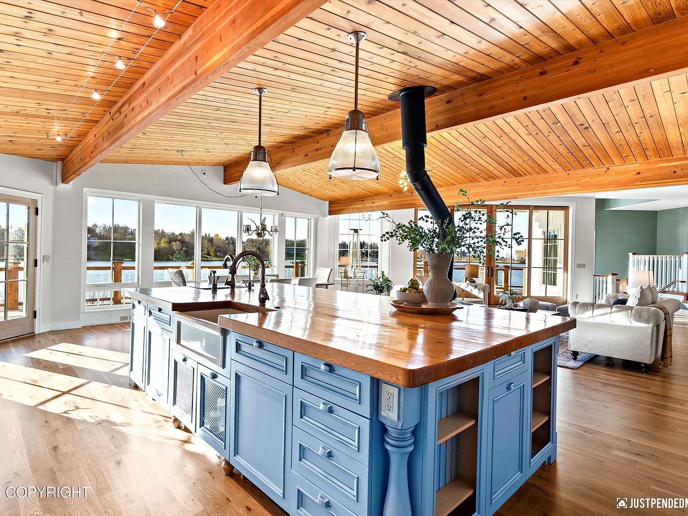 This stylish kitchen features a charming blue island that serves as a focal point, complemented by a warm, wooden countertop. The high, wooden ceiling enhances the spacious layout, adorned with elegant pendant lighting that adds a touch of sophistication. Large windows flood the area with natural light, creating a seamless connection to the picturesque outdoor view. The open-plan design promotes a family-friendly environment, making it perfect for gatherings. Tasteful decor, including a decorative plant centerpiece, and contemporary appliances ensure functionality without sacrificing aesthetics. Light wood flooring further enhances the welcoming atmosphere, ideal for both cooking and entertaining.