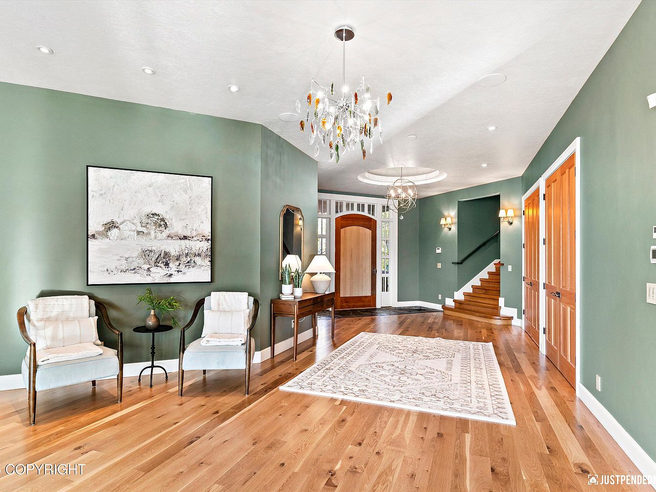 A welcoming entryway greets visitors with a blend of comfort and style. Rich green walls create a serene backdrop, complemented by warm wooden elements. A large piece of abstract art hangs prominently, enhancing the sophisticated atmosphere. Two elegantly designed chairs invite relaxation alongside a small side table adorned with a potted plant, perfect for adding a touch of nature. The polished hardwood floor extends through the space, providing durability and warmth. A unique chandelier illuminates the room, while the open staircase offers a glimpse into the home’s inviting layout, making it ideal for families and entertaining guests.