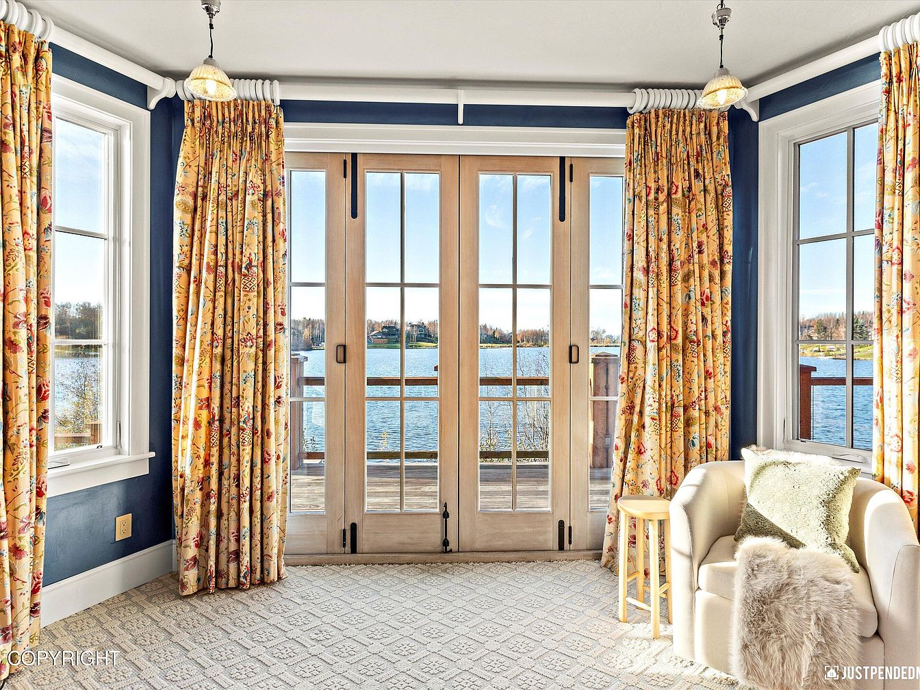 This inviting sunroom features a tranquil view of the water, accentuated by large windows that flood the space with natural light. The soft blue walls create a serene backdrop, while the vibrant floral drapes add a cheerful touch, enhancing the room’s warmth. A cozy armchair, highlighted by plush cushions, invites relaxation, complemented by a sleek, minimalistic side table. The light-colored rug adds texture and comfort underfoot, creating a soft contrast against the overall color scheme. Architectural details, such as the elegant molding and stylish pendant lights, contribute to the room’s charm, making it a perfect family-friendly haven.
