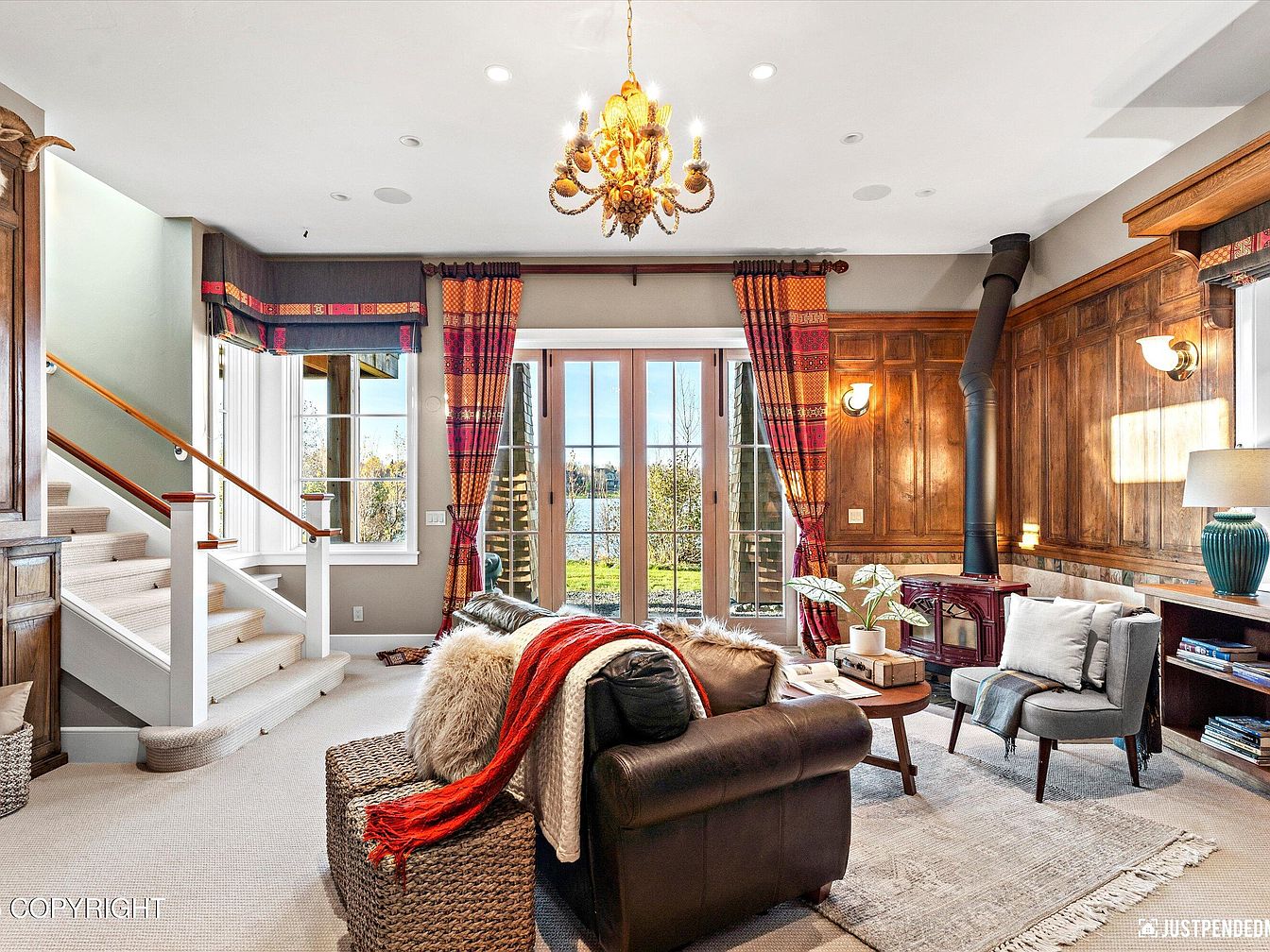 This inviting living area features a warm, rustic charm with its rich wood paneling and stylish decor. A blend of modern and traditional aesthetics is evident, highlighted by a plush leather couch draped with a vibrant red throw and soft pillows. Large, light-flooded windows showcase picturesque views, bringing the outside in and emphasizing the connection to nature. The intricate curtains complement the room’s earthy color palette, while the contemporary chandelier adds an elegant touch. A round wooden coffee table sits center stage, inviting family gatherings, while the nearby stove offers warmth and coziness during chilly evenings.