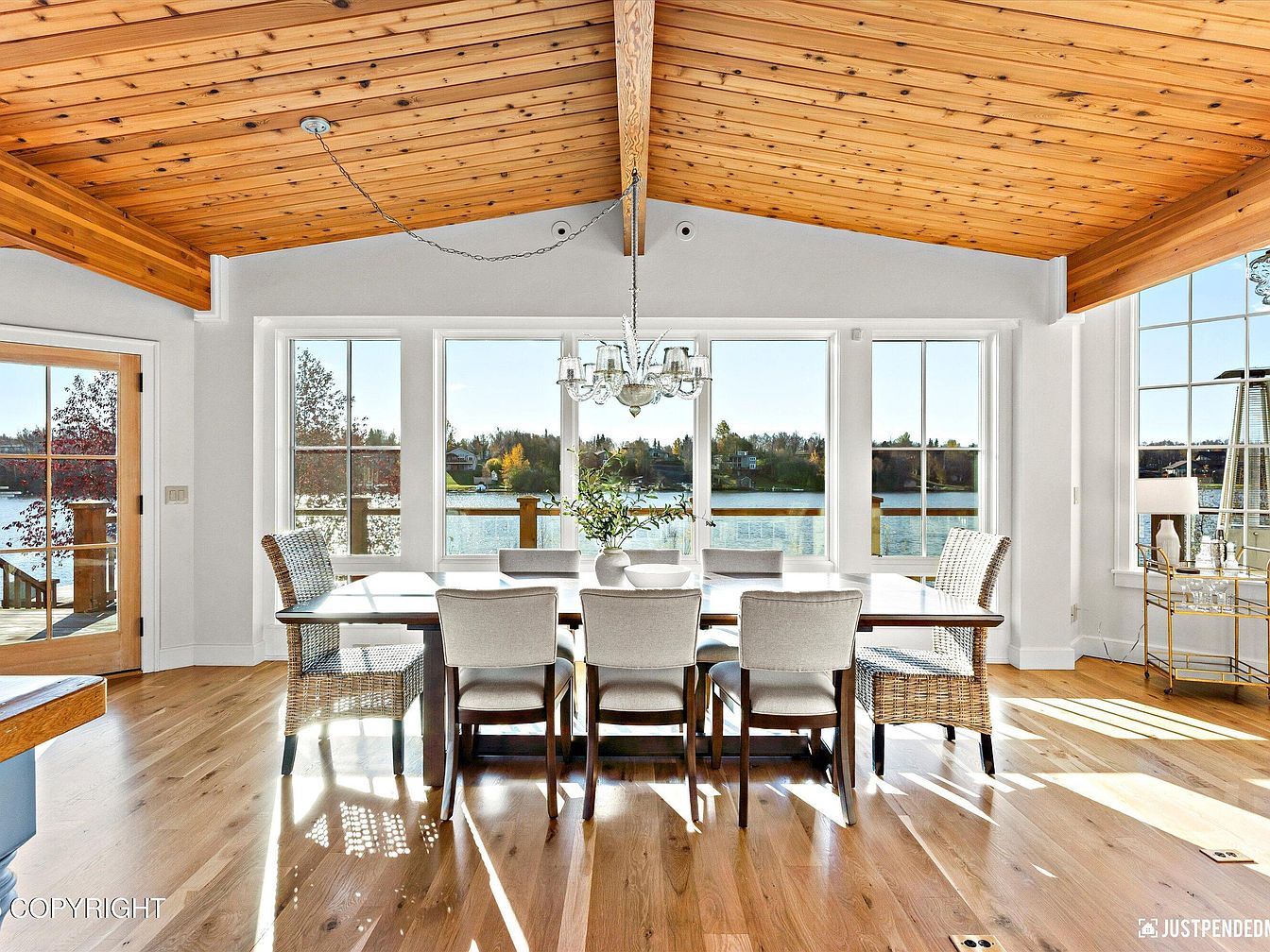 A spacious dining area exudes warmth and elegance, featuring a large wooden table surrounded by comfortable upholstered chairs and woven seats. The high, vaulted ceiling showcases beautifully crafted wooden beams, enhancing the room’s airy ambiance. Large windows flood the space with natural light, offering breathtaking views of the tranquil waters outside. Light-colored walls complement the rich tones of the wood, creating a serene environment. The refined chandelier adds a touch of sophistication, while the natural wood flooring provides durability and easy maintenance, making it a family-friendly option for gatherings and everyday meals.