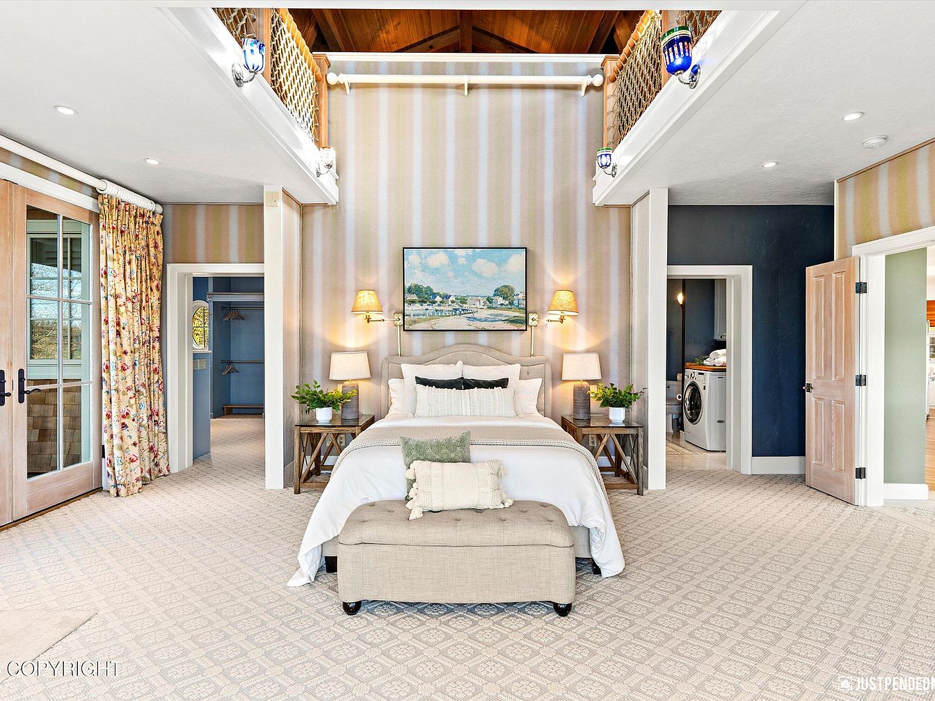 This exquisite master bedroom features a spacious layout with vaulted ceilings highlighted by rich wooden beams. Soft pastel stripes adorn the walls, creating a soothing ambiance. The furniture combines elegance with comfort, including a plush bed adorned with multiple decorative pillows, complemented by a chic light beige bench at its foot. A cozy reading nook is defined by a tasteful side table and matching lamp, while large glass doors usher in natural light and offer views of the outdoors. Enclosed cabinets provide ample storage, making this a family-friendly space that balances style and functionality perfectly.