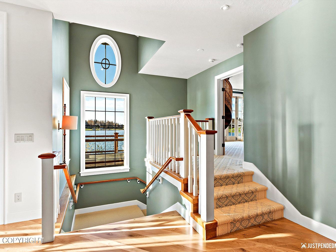 This elegant staircase welcomes you with its sophisticated design, featuring natural wood railings contrasted against a soft green wall that evokes a sense of tranquility. The plush carpet runner adds a family-friendly touch, ensuring safety while enhancing comfort. A large, circular window bathes the space in natural light, showcasing stunning views of the surrounding landscape. Adjacent to the stairs, sleek lighting fixtures provide a warm glow, perfect for evening gatherings. Architectural elements, like the detailed molding and open layout, contribute to a modern yet inviting atmosphere, making this entryway a seamless transition to the heart of the home.