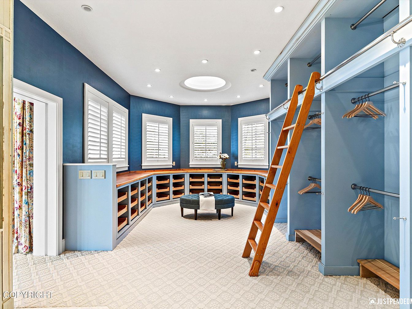 This elegant walk-in closet features a spacious layout that maximizes storage and accessibility. The soothing blue walls create a serene ambiance, complemented by natural light streaming through the large windows adorned with stylish shutters. A circular skylight enhances the openness of the room. Custom built-in shelving and hanging racks provide ample space for clothing organization. A cozy, round ottoman offers a perfect place to sit while choosing outfits. The wooden ladder adds a touch of rustic charm and practical functionality, while the patterned flooring ties the design together, making it both a functional and inviting space.