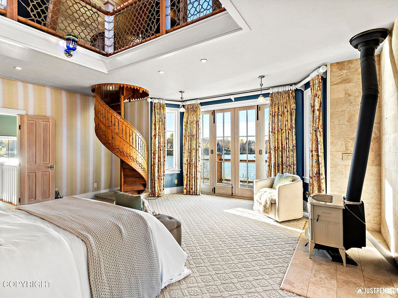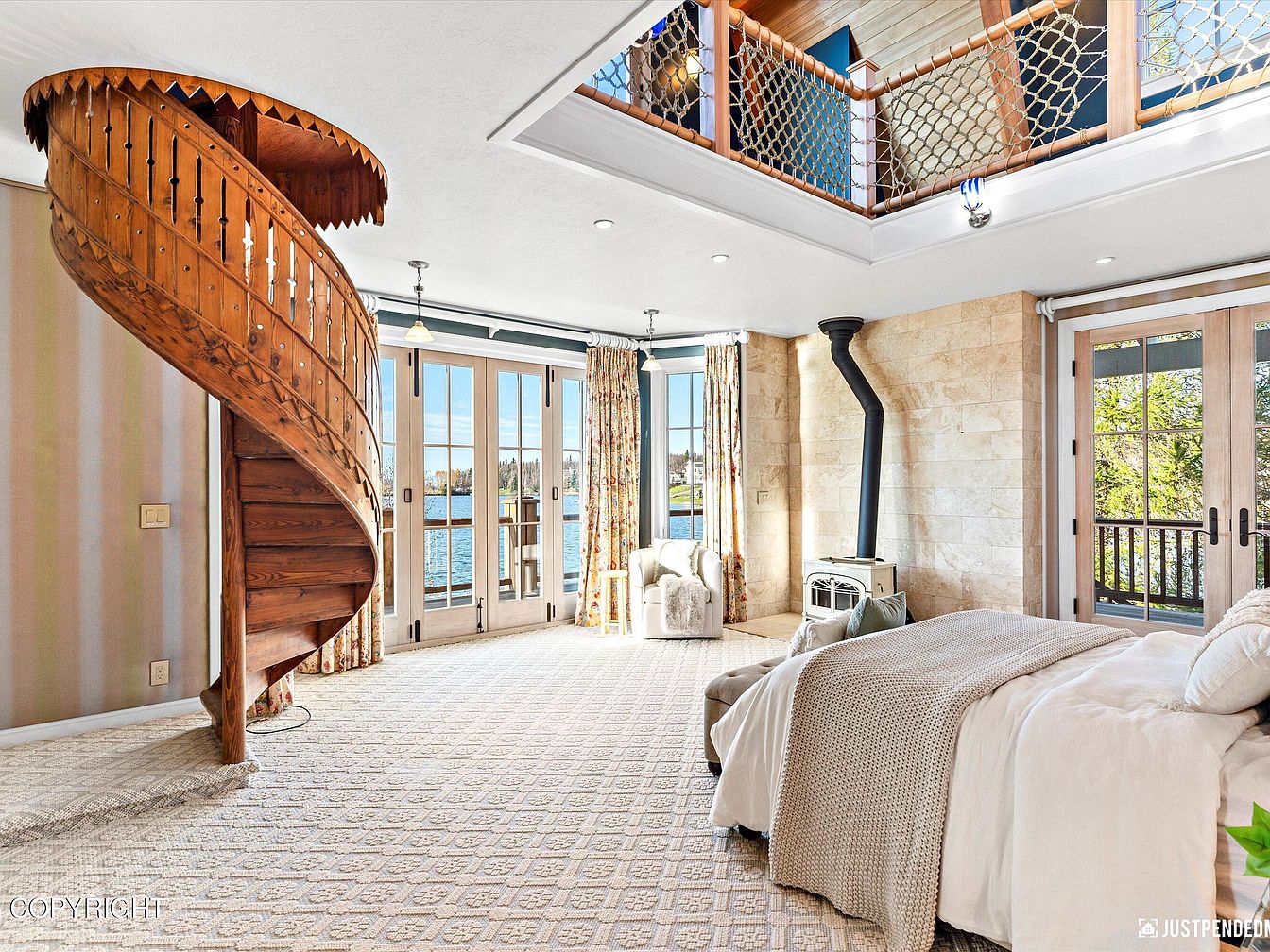 This spacious master bedroom features a harmonious blend of cozy and elegant design elements. A warm, spiral wooden staircase adds a unique architectural touch, seamlessly connecting to the upper level. The room radiates with natural light, accentuated by large windows draped in colorful floral curtains that enhance the inviting atmosphere. A plush area rug provides a soft foundation, complementing the neutral tones of the warm beige walls and bed linens. An inviting reading nook, complete with a comfortable chair, invites relaxation. A charming wood-burning stove anchors the room, offering a family-friendly ambiance perfect for cozy evenings.
