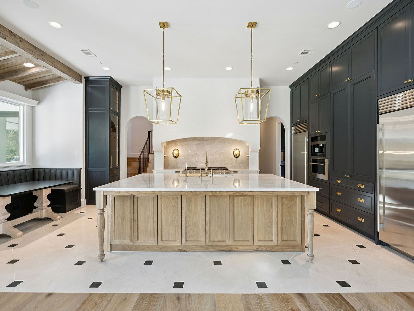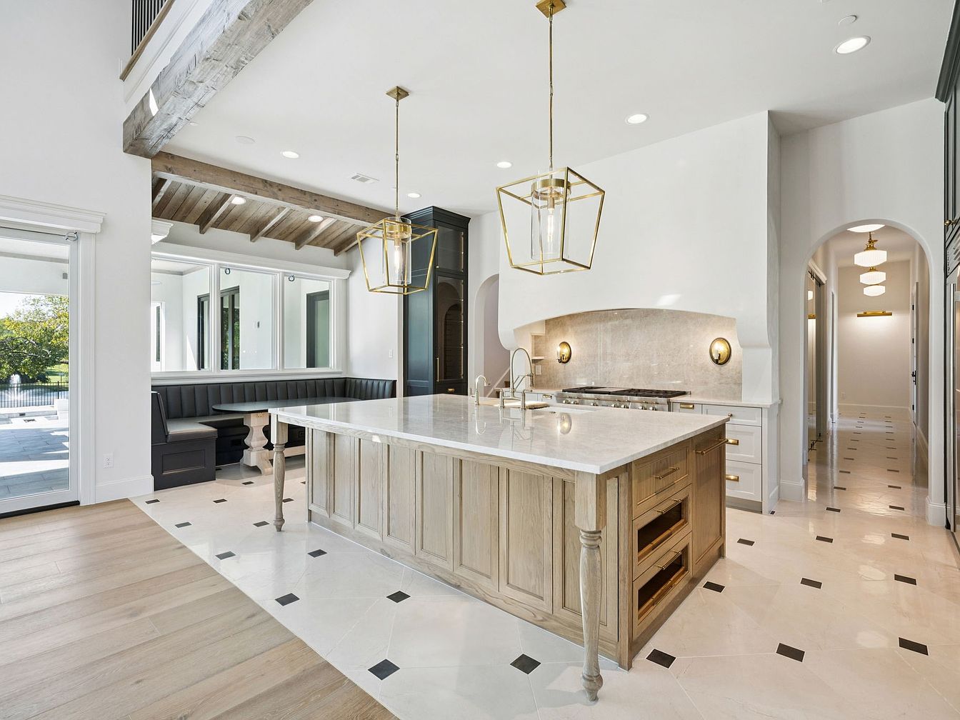 A stunning modern kitchen featuring a spacious island with a distressed wood base and white marble countertop, perfect for family gatherings. The open layout allows for seamless interaction with living spaces, enhanced by warm wooden beams overhead that add rustic charm. Complementary black cabinetry and sleek gold fixtures create an elegant contrast. A cozy banquette seating area invites family meals, while large windows ensure an abundance of natural light. The polished tile flooring, accented with black and white details, enhances the sophisticated aesthetic, making this kitchen not just functional but truly inviting and stylish.