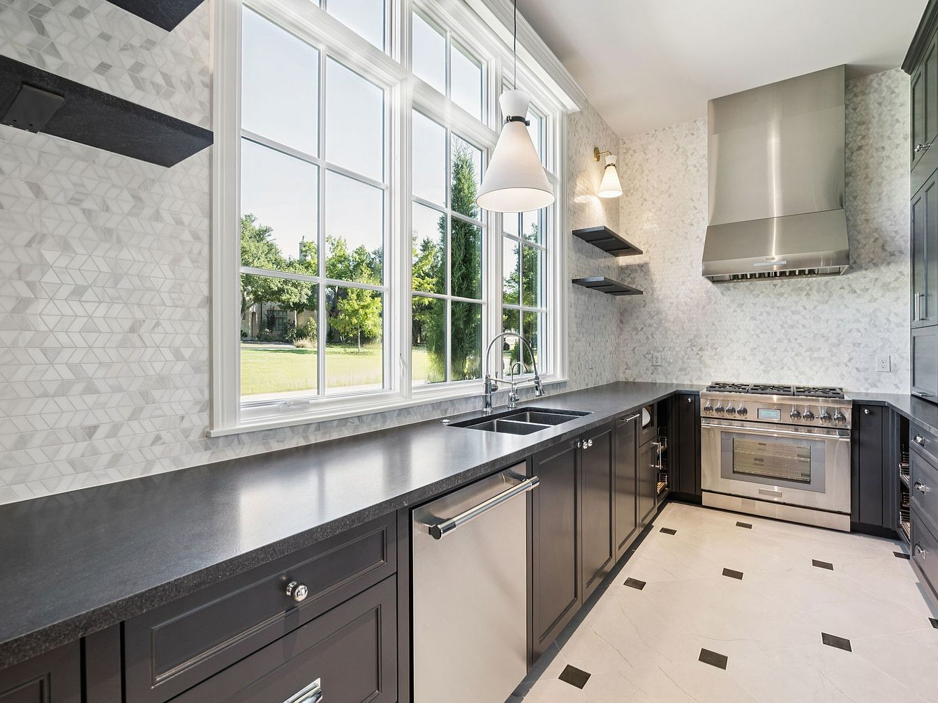 This modern kitchen features a sleek, efficient layout emphasizing functionality and style. The striking contrast between the dark cabinetry and the light, geometric backsplash creates visual interest, while the black quartz countertops offer durability and elegance. Massive windows flood the space with natural light, enhancing the fresh, airy atmosphere. Family-friendly elements include ample counter space and a spacious design that encourages gatherings. Stainless steel appliances, including a professional-grade range, provide both aesthetic and practical appeal. Creative shelving adds character and storage solutions, making this kitchen a perfect blend of form and function for daily life.