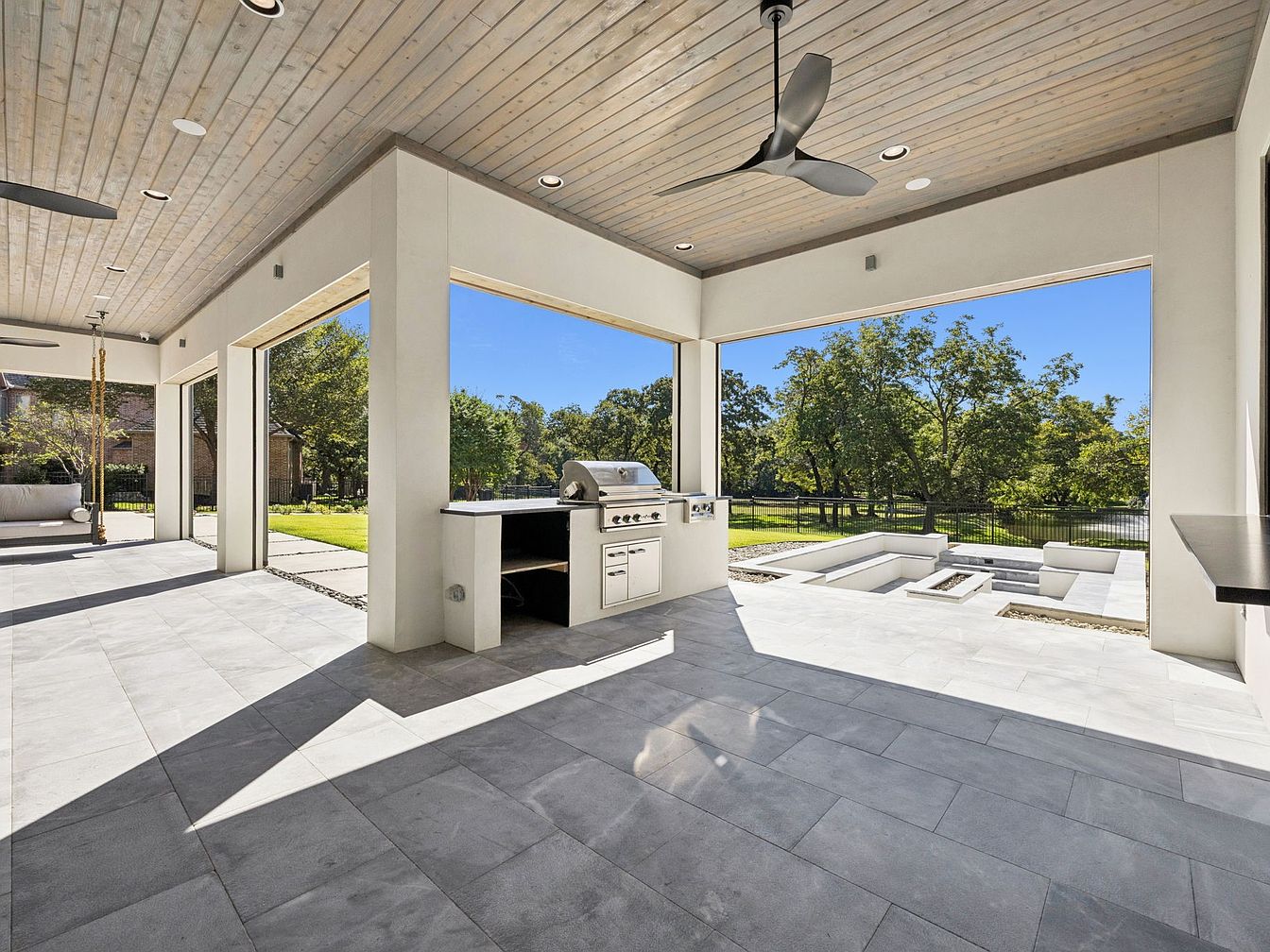 This outdoor patio seamlessly merges indoor and outdoor living, featuring expansive, sliding glass doors that open to a lush backyard. The ceiling showcases beautiful wooden beams, enhancing the airy, open feel of the space. A built-in grill and sophisticated outdoor kitchen cater to family gatherings and barbecues, while a modern fan helps maintain comfort on warm days. The sleek, gray tiled flooring contributes a contemporary touch, complementing the neutral color palette of the walls. With plenty of space for seating and relaxation, this patio invites family and friends to enjoy the surrounding nature and a tranquil ambiance.