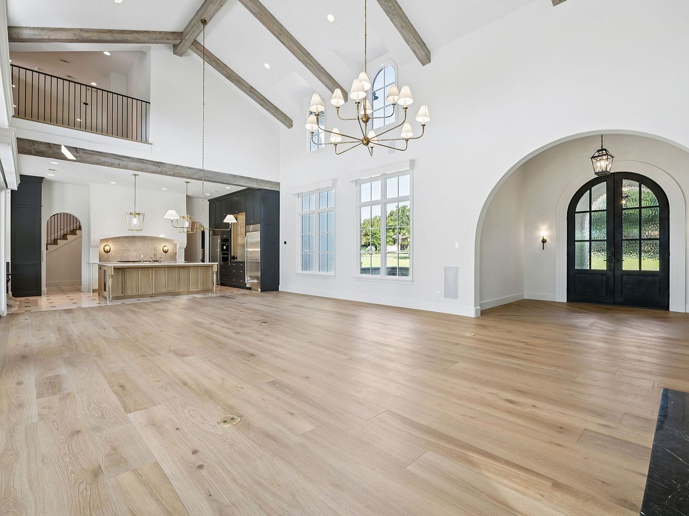 This expansive great room features soaring ceilings adorned with rustic wooden beams, marrying modern elegance with a cozy ambiance. The large windows invite natural light, highlighting the warm, light-toned hardwood floors that extend throughout the space. A central island, crafted from rich wood, serves as a focal point in the open layout, complemented by bespoke cabinetry in soft shades. Architectural arches frame the elegant entryway, leading to a stylish stairway, adding depth and charm. Family-friendly design is evident in the spaciousness, offering ample room for gatherings, while a sophisticated chandelier enhances the airy atmosphere.