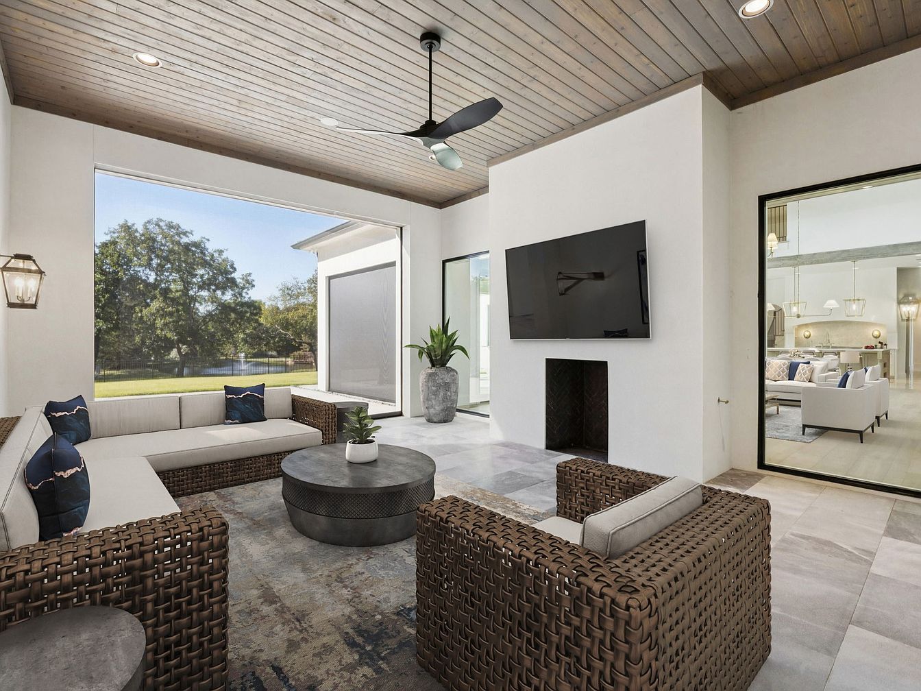 This inviting outdoor living space blends comfort and style, perfect for family gatherings or quiet relaxation. Featuring a modern ceiling with warm wood tones and recessed lighting, the covered area ensures year-round enjoyment. Plush wicker seating adorned with cozy blue pillows invites conversations, while a wooden coffee table adds a touch of rustic charm. Expansive glass doors seamlessly connect the indoors to the lush backyard, where verdant trees create a picturesque setting. Neutral color tones and natural textures enhance the ambiance, making this a serene retreat for all ages, ideal for entertaining or unwinding in nature’s embrace.