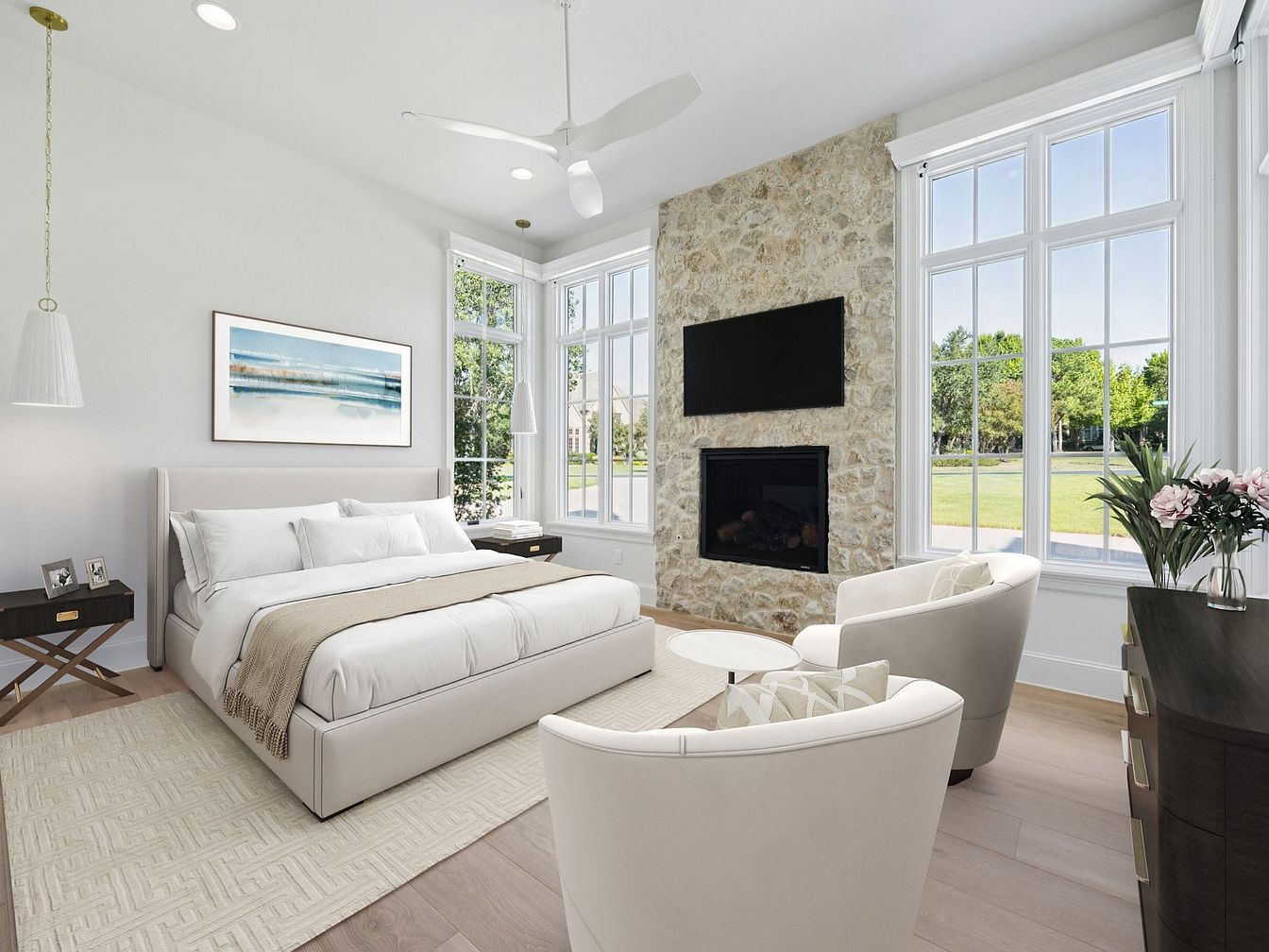 A serene master bedroom exuding comfort and elegance, featuring a plush king-sized bed adorned with crisp white linens and a soft beige throw. Natural light floods in through large windows, highlighting the soft color palette of whites and earth tones. A unique stone accent wall holds a modern fireplace, perfect for cozy evenings. The space includes stylish armchairs, inviting relaxation alongside a minimalistic side table. Thoughtful details like pendant lighting and a textured area rug enhance its warmth. Designed for family-friendly living, this room blends functionality with tranquility, creating an idyllic retreat for rest and rejuvenation.