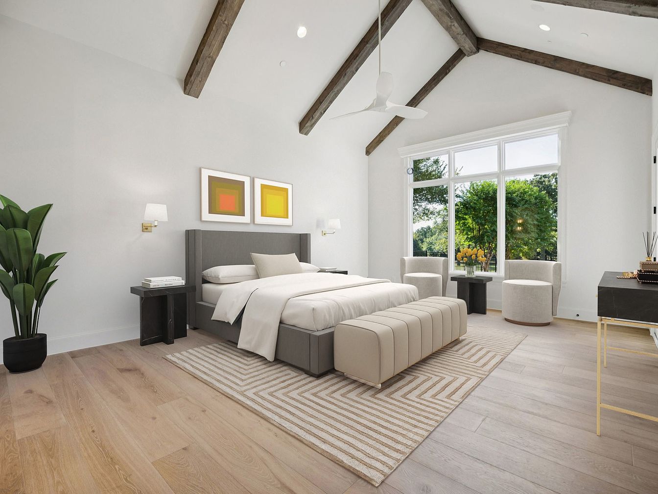 This master bedroom embodies a serene, modern aesthetic with its high vaulted ceiling and exposed wooden beams that create an open, airy feel. The soft, neutral color scheme features light gray walls and wooden flooring, enhancing the calming atmosphere. A plush bed with a sleek, upholstered headboard is the focal point, complemented by stylish side tables and soft lighting. Cozy, circular chairs invite relaxation, while large windows frame views of lush greenery outside, integrating nature into the space. The addition of geometric patterns in the area rug balances comfort with style, making this room both inviting and family-friendly.