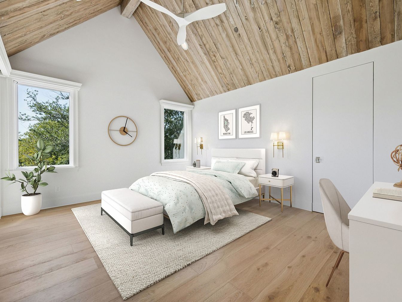 This serene master bedroom features a stunning vaulted ceiling adorned with rustic wooden beams, imparting a cozy yet sophisticated atmosphere. The light color palette, highlighted by soft whites and gentle greens, creates a tranquil space perfect for resting. Large windows invite natural light, presenting picturesque views of the outdoors and enhancing the room’s airy feel. Elegant furniture, including a plush bed and chic armchair, combines comfort with style. Thoughtfully selected decor elements, such as botanical accents and framed art, add a personal touch, making this room an inviting retreat for relaxation or peaceful solitude.
