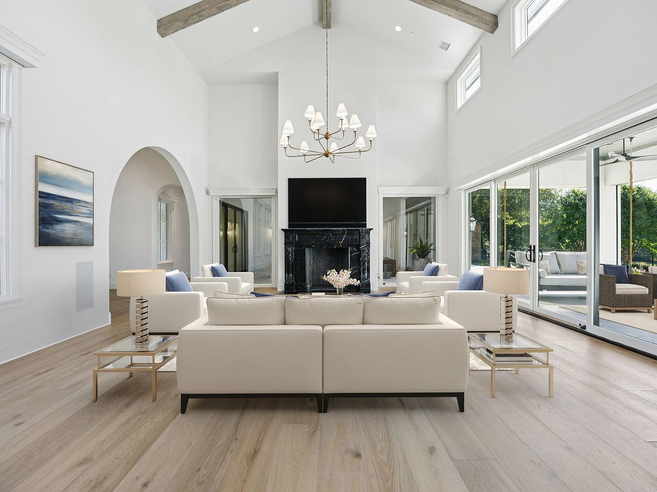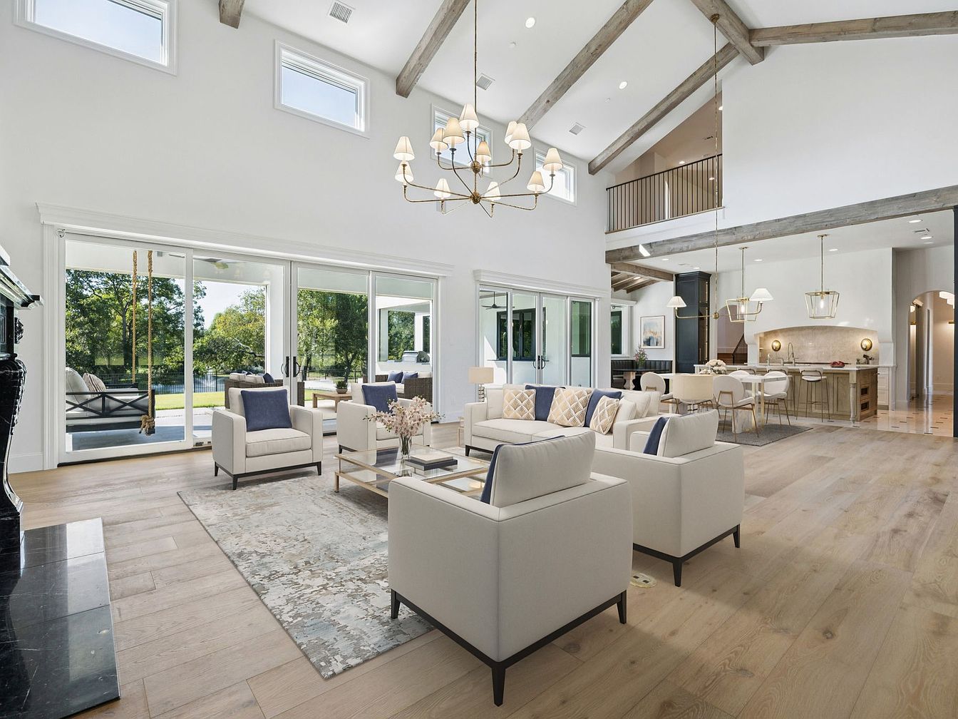 This expansive living area showcases an open floor plan, seamlessly connecting the spaces for family interaction and entertaining. Bright, natural light floods through large sliding glass doors, offering picturesque views of the lush outdoor surroundings. The high ceilings and exposed wooden beams add height and character, while the modern chandelier enhances elegance. Soft neutrals are accented by navy and gold details in the upholstery, creating a harmonious color palette. Cozy seating arrangements invite conversation, complemented by a stylish area rug that defines the space. Perfect for family gatherings, this home blends comfort with sophisticated design.