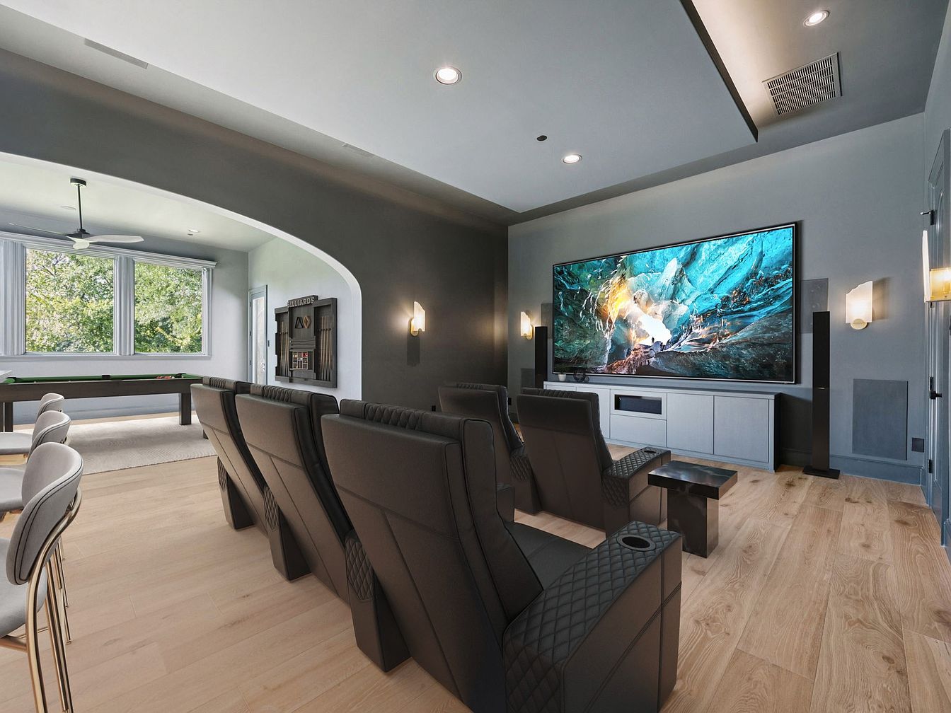 A stylish media room blends comfort and modernity, featuring plush, reclined seating arranged for optimal viewing of a large, wall-mounted television. The design incorporates an open layout, seamlessly connecting to a pool table area, encouraging social interaction. A soothing palette of grays and muted hues is complemented by warm wooden floors, creating an inviting atmosphere. Natural light floods in through large windows, enhancing the space’s vibrancy. Architectural details include elegant sconce lighting and an arched entryway, adding sophistication. This family-friendly environment is perfect for movie nights or game sessions, ensuring memorable experiences for all.