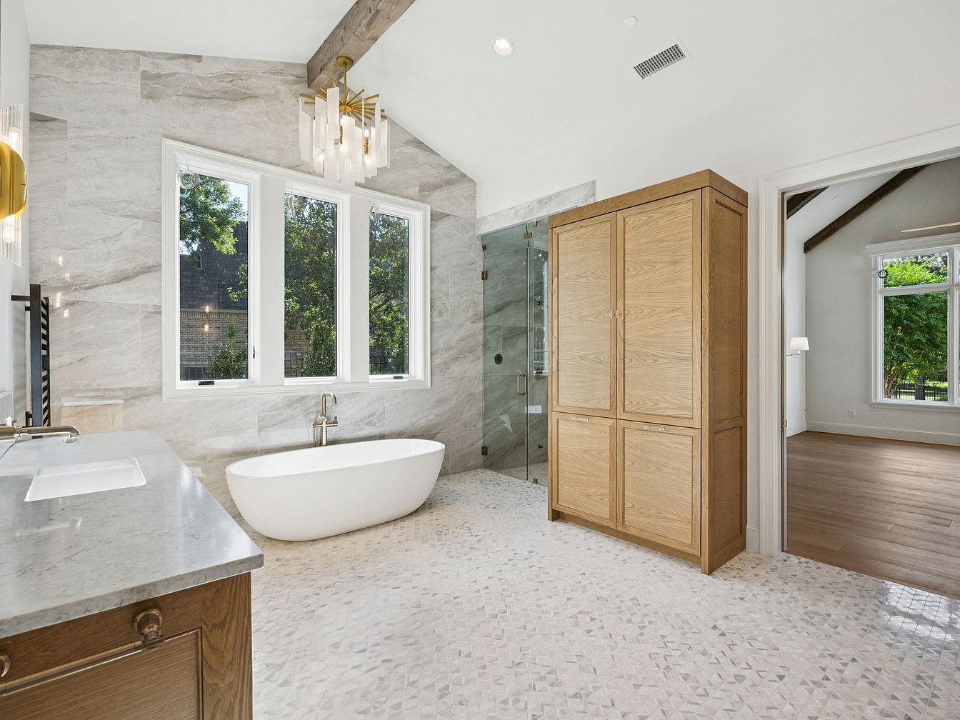 A tranquil modern bathroom featuring a freestanding white tub seamlessly integrated against a backdrop of luxurious marble walls. Expansive windows invite natural light, highlighting the elegant space while providing serene views of the outdoors. The polished stone flooring, with its subtle mosaic pattern, complements the elegant cabinetry crafted from warm wood, enhancing the inviting atmosphere. Architectural details include exposed wooden beams that add warmth and character, while stylish fixtures, including a chic chandelier, offer a touch of sophistication. Ample storage ensures a family-friendly design, making this oasis both functional and aesthetically pleasing for daily use.