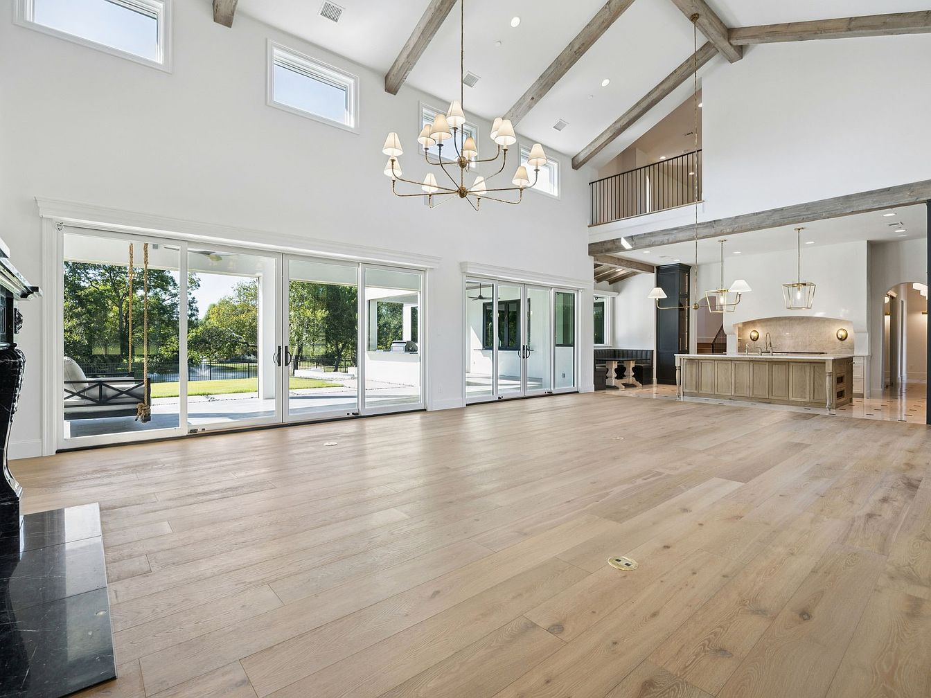 This expansive open-concept living area seamlessly merges style and comfort, featuring vaulted ceilings adorned with rustic wooden beams that provide an inviting, airy atmosphere. The light hardwood flooring enhances the warmth of the space, while oversized glass doors flood the room with natural light and provide easy access to the outdoor area. A contemporary chandelier and elegant kitchen island anchor the space, showcasing a blend of modern and traditional elements. The neutral color palette promotes relaxation, while family-friendly features, such as ample seating and direct outdoor access, make it perfect for gatherings and everyday living.
