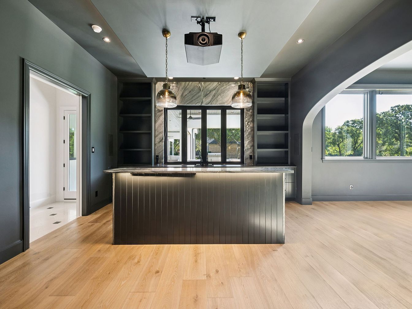 This chic kitchen bar features a stunning blend of contemporary design and functionality. The sleek gray walls complement the polished wooden floor, enhancing the warmth of the space. A beautifully curved ceiling introduces elegance, while the striking pendant lights cast a welcoming glow over the expansive island with a marble top. Ample shelving offers convenient storage for kitchen essentials, ensuring easy organization. Large windows invite natural light, creating a bright atmosphere perfect for family gatherings. The thoughtful layout underscores both style and livability, making it an ideal hub for culinary adventures and entertaining guests.