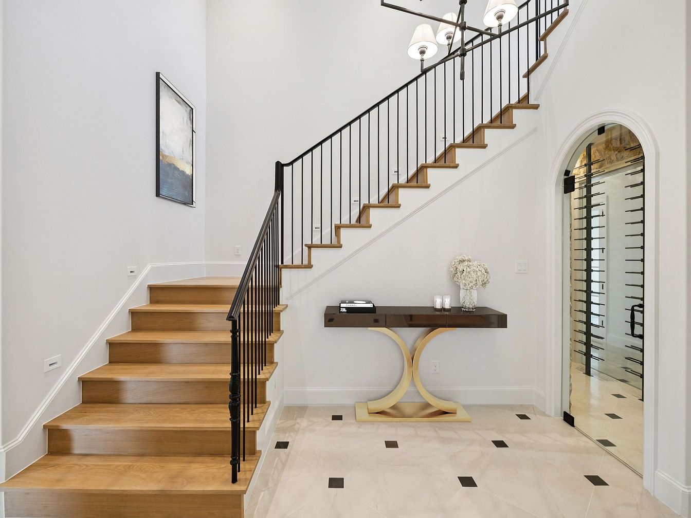The entry hallway features a stunning staircase with natural wood steps and a sleek black railing that leads to the upper levels. An elegant light fixture hangs from the high ceiling, illuminating the space with a warm glow. The floor is adorned with luxurious large-format tiles in a soft cream hue, punctuated with black accents that create a sophisticated contrast. A stylish console table with a unique design provides a practical yet decorative element, complemented by fresh flowers and ambient candlelight. The overall design showcases a blend of modern elegance and functionality, welcoming guests with open arms.
