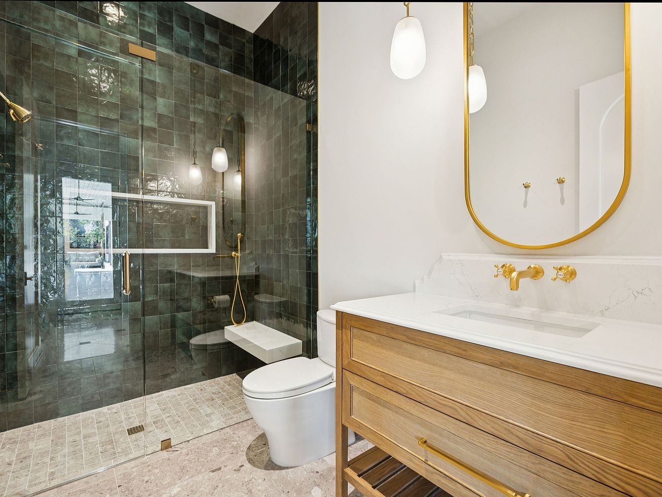 This stunning bathroom features a modern layout with an open shower area framed by sleek glass panels. The deep green tile creates a lush, sophisticated backdrop, while the bright white vanity adds contrast with its marble countertop and warm wooden storage. Gold fixtures provide a touch of elegance and charm, enhancing the space’s luxurious feel. Energy-efficient lighting with soft, ambient bulbs creates a welcoming atmosphere, complemented by the large, round mirror that reflects natural light. Thoughtfully designed for comfort and style, this bathroom is perfect for families, combining functionality with aesthetic appeal in a serene environment.