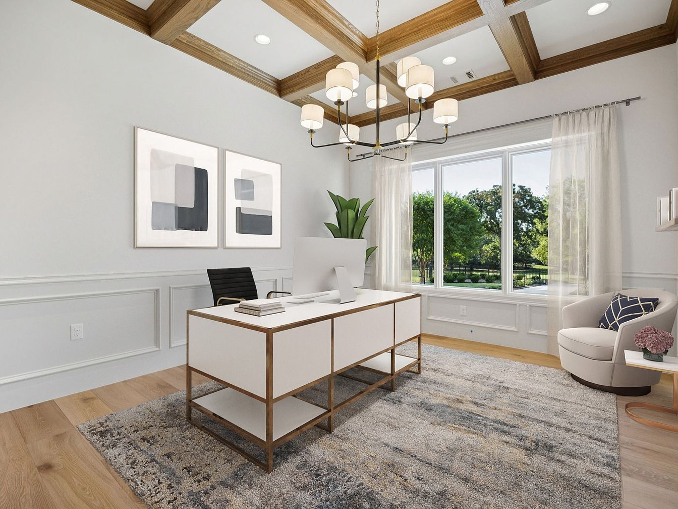 This beautifully designed home office boasts a seamless blend of style and functionality. A spacious layout features a sleek, modern desk with clean lines, complemented by an ergonomic black chair. The warm wooden coffered ceiling adds depth, while contemporary artwork graces the walls, echoing a calming color palette of soft grays and whites. A large window invites natural light, enhancing the room’s airy feel and offering serene views of the landscape outside. Decorative touches include a plush area rug, a stylish armchair for relaxation, and a vibrant potted plant, creating an inviting, family-friendly workspace.