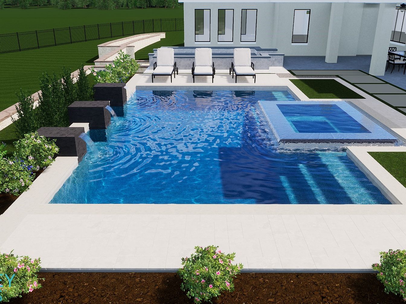 An inviting backyard oasis features a stunning swimming pool, complete with a luxurious built-in spa. The generous layout showcases soothing water features that cascade from sleek black stone accents, enhancing the tranquil atmosphere. Adorned with well-manicured greenery and vibrant flowers, the space offers a perfect balance of nature and modern design. Comfortable lounge chairs provide ideal spots for relaxation and sunbathing, while the practical surrounding patio allows for seamless outdoor entertaining. The neutral color palette blends harmoniously with the blue water, creating a serene backdrop for family gatherings and leisure activities, perfect for all ages.