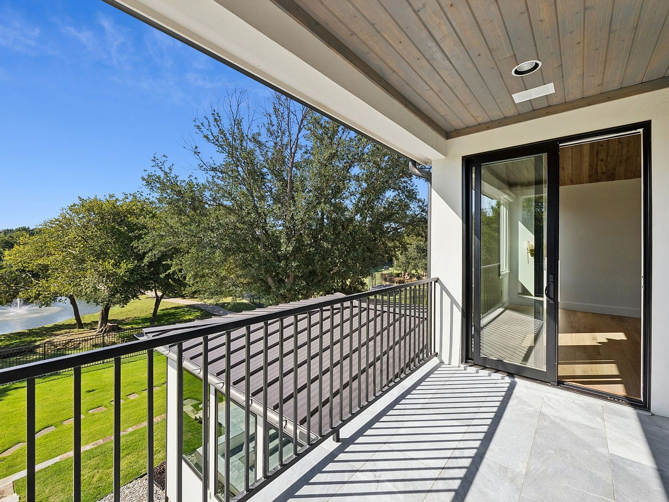 This stunning balcony offers an idyllic retreat, showcasing a seamless blend of indoor and outdoor living. The sleek glass doors invite natural light while providing easy access to breathtaking views of lush greenery and a serene waterway. A stylish metal railing complements the modern architecture, accentuating clean lines and open space. The ceiling features warm, reclaimed wood, enhancing the cozy ambiance. Elegant stone flooring provides a durable surface for relaxation. Family-friendly elements are thoughtfully incorporated, making this outdoor haven perfect for gatherings or peaceful evenings. Experience tranquility while enjoying the beauty of nature right at your doorstep.