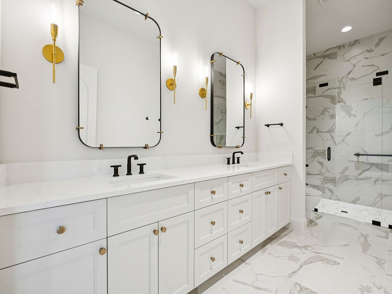 This spacious bathroom features a stunning double vanity with clean white cabinetry and luxurious marble countertops. Elegant black fixtures contrast beautifully with the soft white walls, enhancing the modern aesthetic. The geometric mirrors are framed in a chic gold metal, adding a touch of sophistication. Warm sconce lighting creates an inviting atmosphere, perfect for family use. The carefully chosen marble flooring offers both style and durability, enhancing the room’s contemporary feel. A glass-enclosed shower, adorned with intricate tile work, provides a spa-like experience, rounding out this well-designed space that blends functionality with refined elegance.