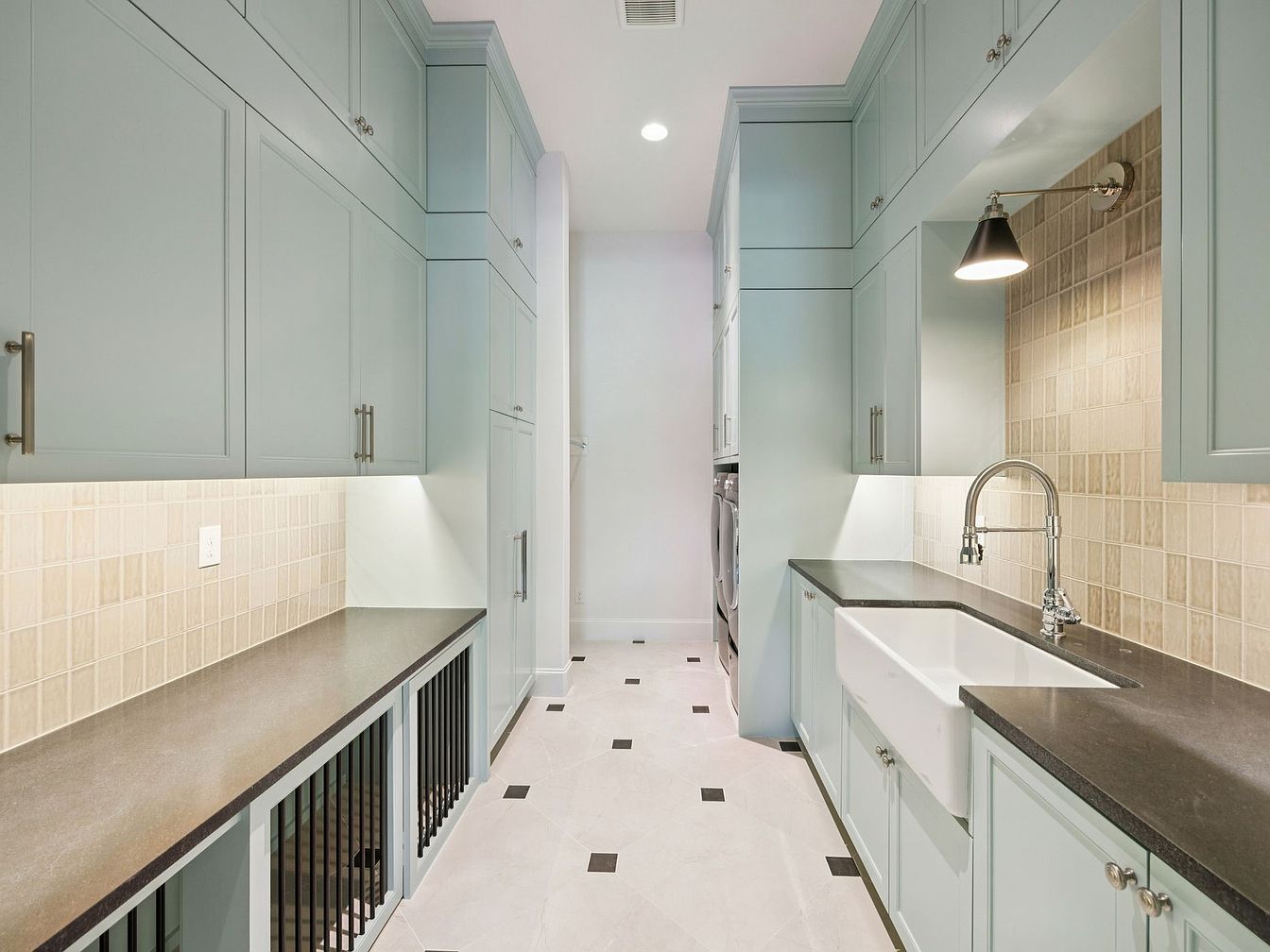 A modern laundry area boasts a seamless blend of functionality and style. Gorgeous light blue cabinetry flanks both sides, providing ample storage space, while its sleek design adds a touch of elegance. The rich, dark countertop contrasts beautifully with the cabinetry, serving as an ideal workspace for folding laundry. Understated beige tiles with dark accents enhance the floor’s visual interest, making upkeep a breeze. A farmhouse-style sink with a polished faucet highlights convenience, and task lighting above offers both practicality and ambiance. This space is crafted for family life, ensuring chores are efficient yet inspiring.
