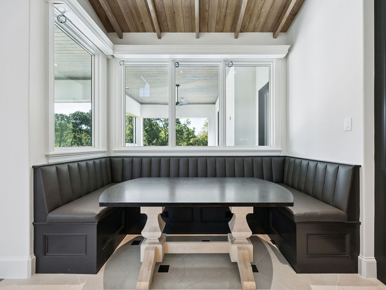 This inviting breakfast nook features a stylish built-in seating area, upholstered in rich dark leather for comfort. The sleek, modern table boasts a sturdy, light-toned base, perfectly complementing the sophisticated black and white color scheme. Generous windows flood the space with natural light, offering serene views of the surrounding greenery. Architectural details like the exposed wooden ceiling beams enhance the room’s warmth and charm. Ideal for family gatherings, the nook prioritizes comfort and functionality, creating a welcoming atmosphere for enjoying meals. This space embodies modern elegance while maintaining a cozy, casual feel, perfect for everyday use.