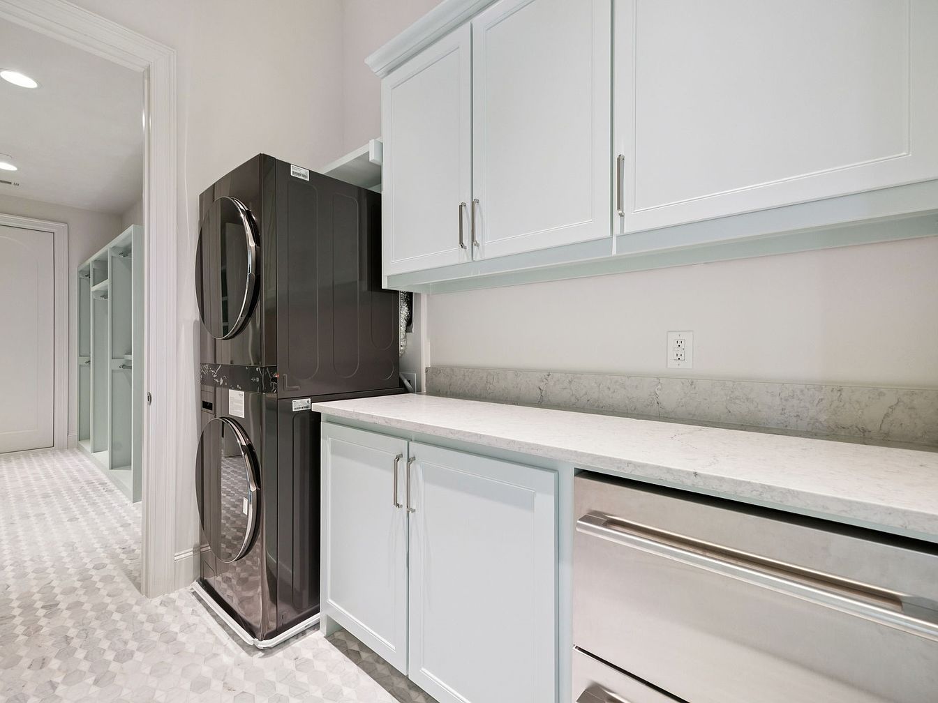 This modern laundry room features a sleek layout, emphasizing both functionality and style. The space is adorned with soft, light-blue cabinetry, providing ample storage for detergents and laundry essentials. A pristine white countertop complements the cabinetry, offering plenty of workspace for folding clothes. The black washer and dryer stand in contrast, merging efficiency with contemporary aesthetics. Textured, hexagonal patterned flooring adds visual interest and durability, while integrated lighting brightens the area. Thoughtfully designed, this family-friendly room ensures laundry day is organized and pleasant, effortlessly blending practicality with a chic, inviting atmosphere.