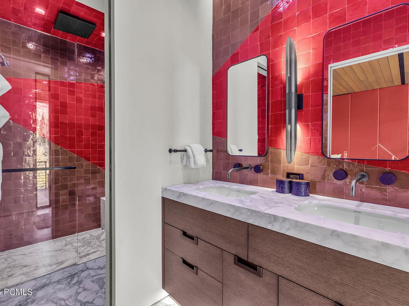 This striking modern bathroom combines bold aesthetics with functionality, featuring a vibrant red and brown tile wall that seamlessly integrates into the shower area. The space showcases dual sinks positioned atop a sleek, light marble countertop, complemented by a rich wooden cabinet that provides ample storage. Unique, oval mirrors enhance the contemporary feel while offering symmetry. Stylish lighting fixtures illuminate the room, highlighting the intricate textures of the tiles and stone. The open layout fosters a sense of freedom, while large windows introduce natural light, making it a welcoming retreat for the entire family.