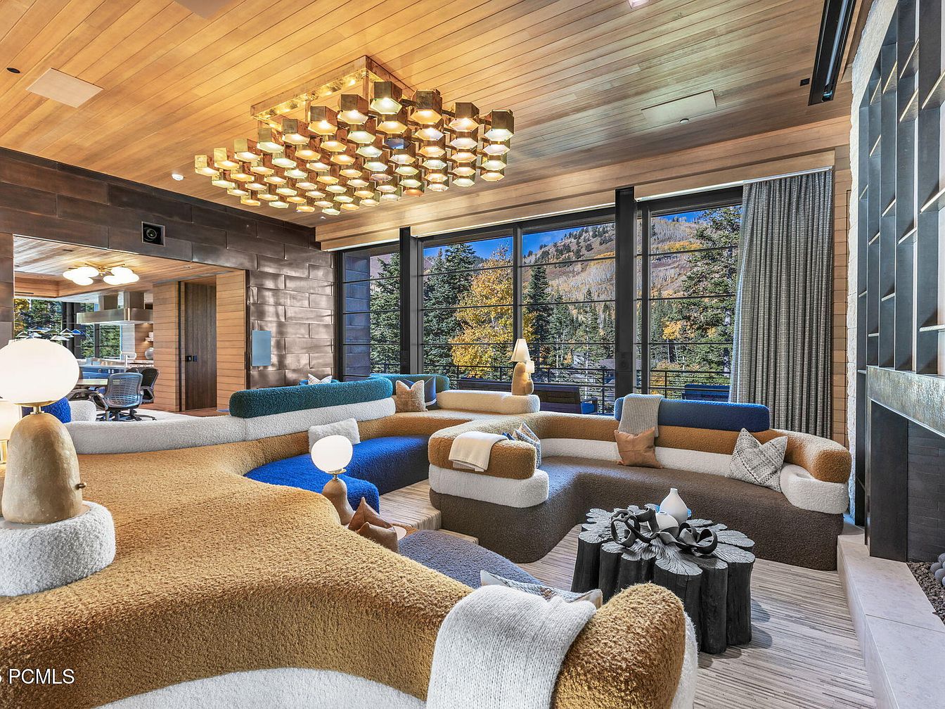 This inviting living space features expansive windows that frame breathtaking mountain views, seamlessly integrating nature into the design. A sleek, modern fireplace serves as a stunning focal point, while warm wood paneling on the ceiling adds a touch of coziness. Stylish furniture, including a custom bench adorned with vibrant throw pillows, creates an inviting atmosphere for family gatherings. The carefully chosen color palette of earthy tones is complemented by textured rugs that enhance the warmth of the space. This thoughtfully designed area is perfect for relaxation or entertaining, showcasing the perfect blend of comfort and modern elegance.