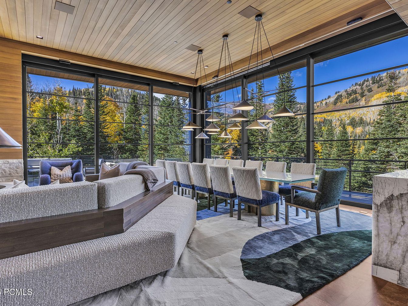This stunning dining area seamlessly combines modern elegance with natural beauty. Expansive glass walls flood the space with light, offering breathtaking views of the surrounding forest, adorned with autumn hues. The room features a sleek, contemporary dining table surrounded by upholstered chairs, enhancing comfort and style for family gatherings. A plush area rug adds warmth and texture, while designer pendant lights provide a touch of sophistication. The open layout flows effortlessly into a cozy seating area with a textured sofa, promoting family engagement. Warm wooden tones in the ceiling and cabinetry beautifully contrast with the light furnishings, creating a welcoming atmosphere.