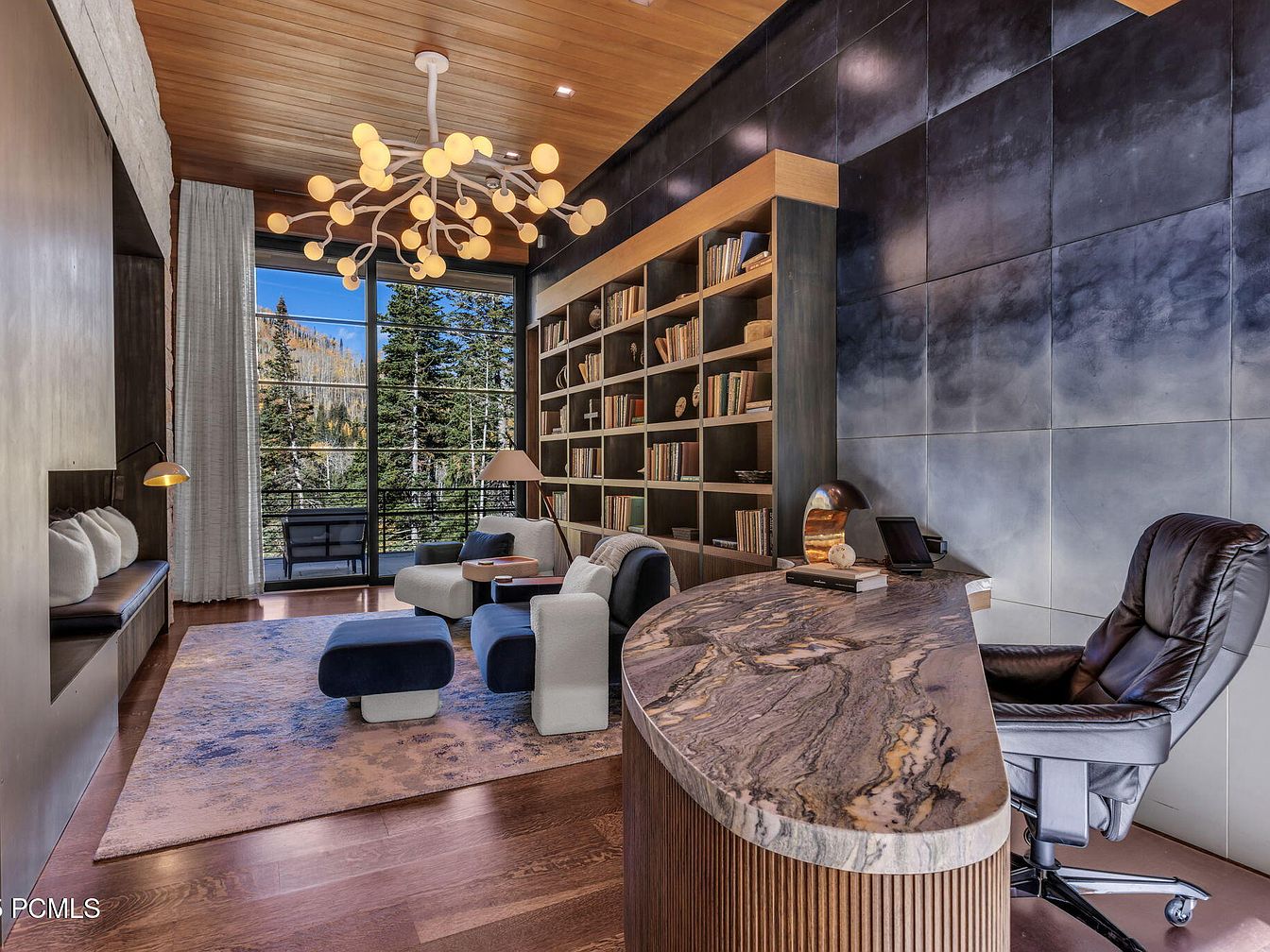 This modern home office features a warm wood ceiling paired with sleek, dark accent walls, creating a sophisticated atmosphere. A large floor-to-ceiling window invites abundant natural light and stunning outdoor views, seamlessly merging indoor and outdoor spaces. The room is thoughtfully arranged with cozy, contemporary seating and a stylish area rug that adds a touch of softness. A curved desk made of rich marble acts as a central focal point, flanked by a comfortable ergonomic chair. Bookshelves filled with books enhance the intellectual charm, making this space perfect for both productivity and relaxation in a family-friendly environment.