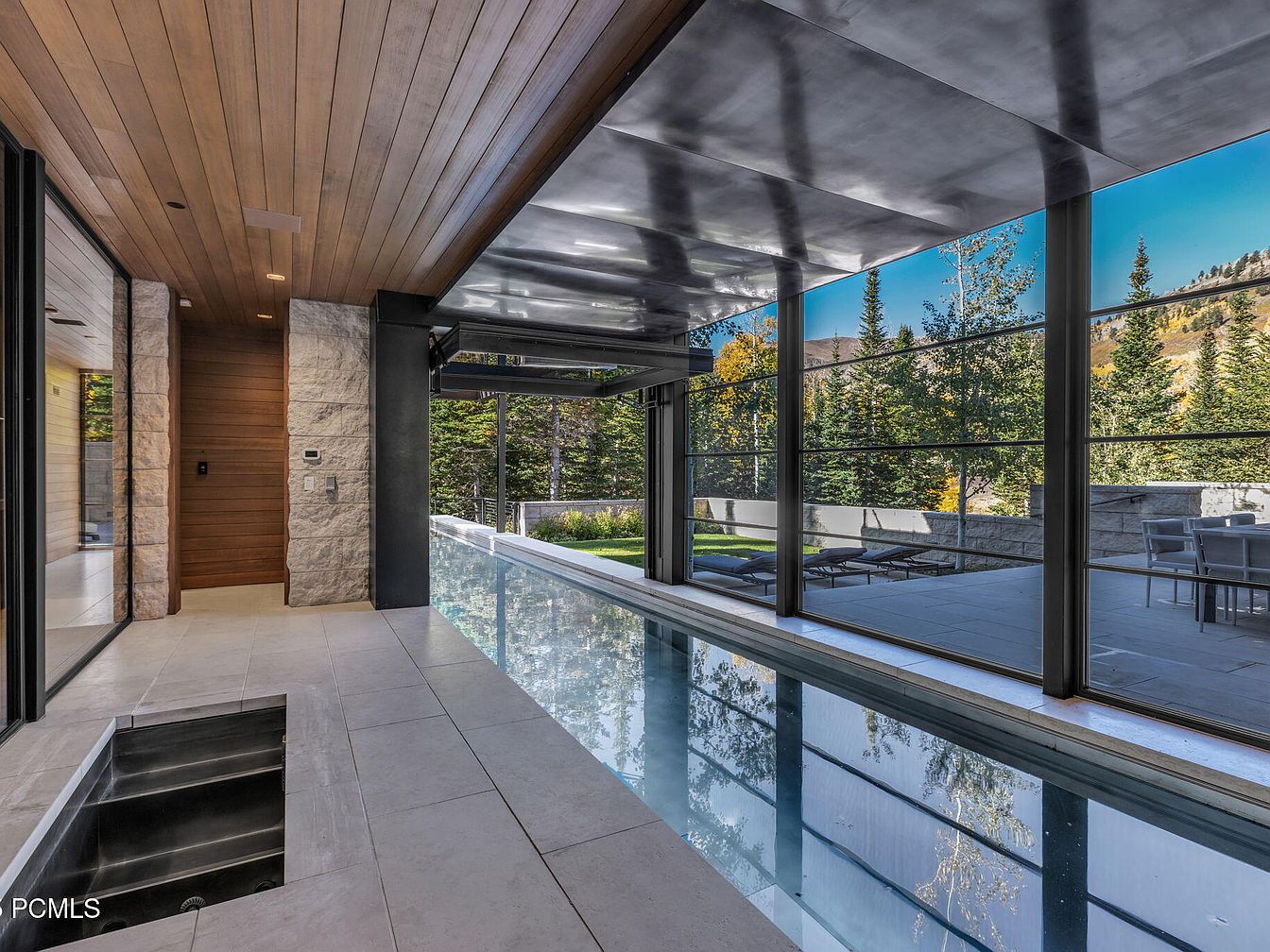 This stunning indoor-outdoor pool area features expansive glass walls that merge the interior with nature. A sleek, modern design showcases a pristine swimming pool lined with elegant tile. The rich wooden ceiling adds warmth against the minimalist stone walls, enhancing the sophisticated ambiance. Family-friendly elements include easy access to an outdoor lounge area with patio furniture, ideal for entertaining or relaxing. The clean lines and neutral color palette create a tranquil environment, emphasizing the surrounding greenery and offering a serene escape. Thoughtfully placed lighting enhances the elegant feels, making this space perfect for year-round enjoyment.