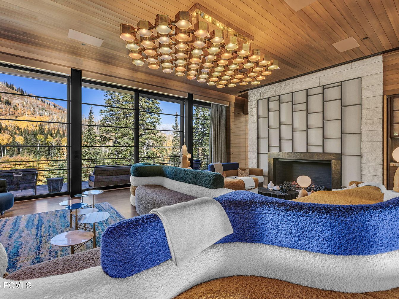 This modern living room showcases breathtaking views through expansive floor-to-ceiling windows, bringing the beauty of nature indoors. The warm wood ceiling contrasts beautifully with the soft, textured furnishings, creating an inviting atmosphere. A striking, hexagonal pendant light hangs above, adding a touch of elegance. The cozy, sculptural sofas in earthy tones invite relaxation and encourage family gatherings. An elegant stone fireplace serves as a focal point, while artfully arranged modern coffee tables enhance functionality. Soft rugs in muted hues anchor the space, making it family-friendly and stylish, perfect for both everyday life and entertaining.