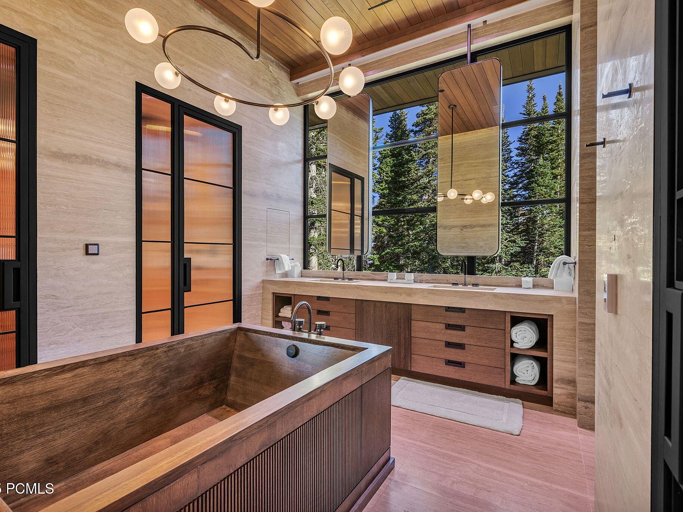 This contemporary bathroom embodies a blend of luxury and functionality, designed with relaxation in mind. The spacious layout features a striking wooden bathtub, elegantly positioned beneath large windows that frame the serene forest view. Walls of warm stone and modern cabinetry in rich wood tones create a calm atmosphere. A minimalist double vanity with sleek, integrated sinks mirrors the architectural lines found throughout the space. The statement pendant light adds a unique touch, while the glass partitions enhance natural light. Thoughtful details like plush towels and storage add to the family-friendly appeal, making this a perfect retreat.