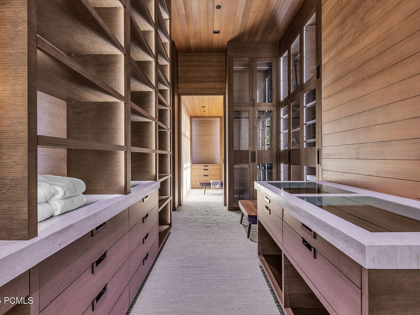 This elegantly designed hallway features a harmonious blend of functionality and aesthetics, ideal for any modern home. Rich wooden tones create a warm atmosphere, complemented by built-in shelving that maximizes storage space without sacrificing style. The pale stone countertops provide a clean contrast, enhancing the design’s sophistication. Thoughtfully placed recessed lighting highlights both the architectural details and the soft textures of the surrounding materials, creating inviting ambiance. Family-friendly features, like ample shelving for easy organization, make this space both practical and beautiful, perfect for keeping essentials within reach while offering an organized, serene environment.