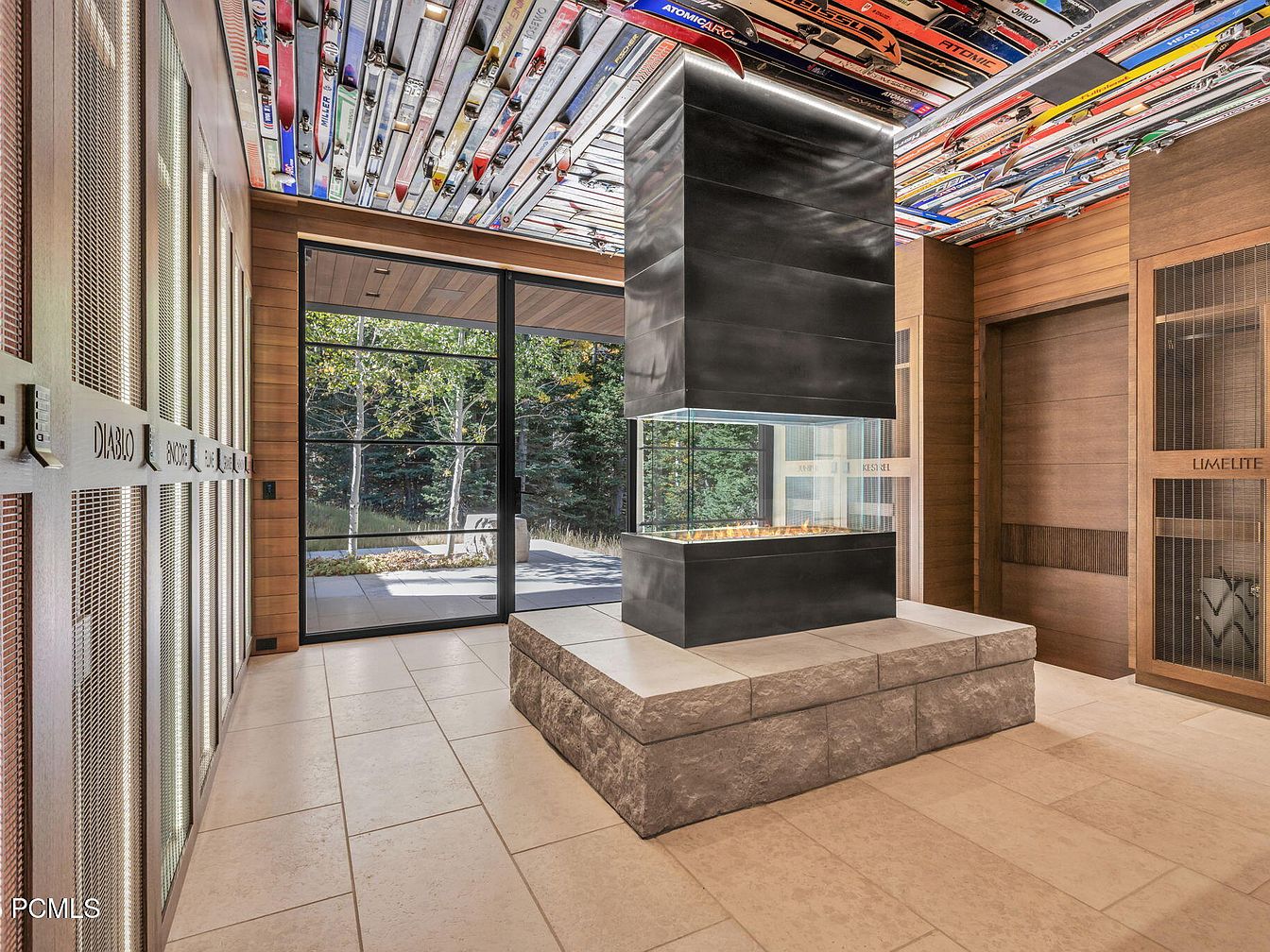 This stunning entryway features a sleek, modern design anchored by a striking double-sided fireplace that serves as an inviting focal point. Overhead, a unique ceiling adorned with colorful ski equipment adds a playful touch, highlighting a connection to outdoor adventures. Expansive glass doors frame picturesque views of the surrounding nature, seamlessly integrating indoor and outdoor spaces. The neutral color palette of warm woods and light tiles creates a welcoming ambiance, while practical storage solutions cater to family needs. This space beautifully balances aesthetics with functionality, making it a perfect introduction to the home’s contemporary charm.