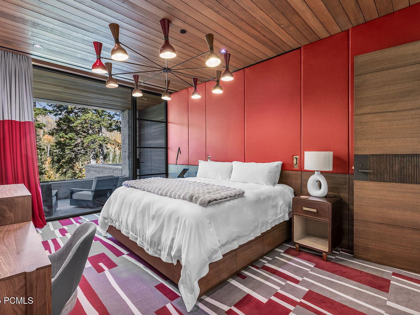 This master bedroom showcases a harmonious blend of modern design and comfort. Rich wooden ceilings complement vibrant red accent walls, creating an inviting atmosphere. A plush king-size bed is adorned with soft white linens and a textured throw, ensuring relaxation. Innovative lighting fixtures enhance the aesthetic, while large windows frame serene outdoor views, seamlessly merging interior and nature. A stylish desk area and ergonomic chair provide a functional workspace, supporting family-friendly needs. The contemporary area rug features a playful geometric pattern, tying together the room’s color scheme. This space is perfect for unwinding and enjoying restful nights.