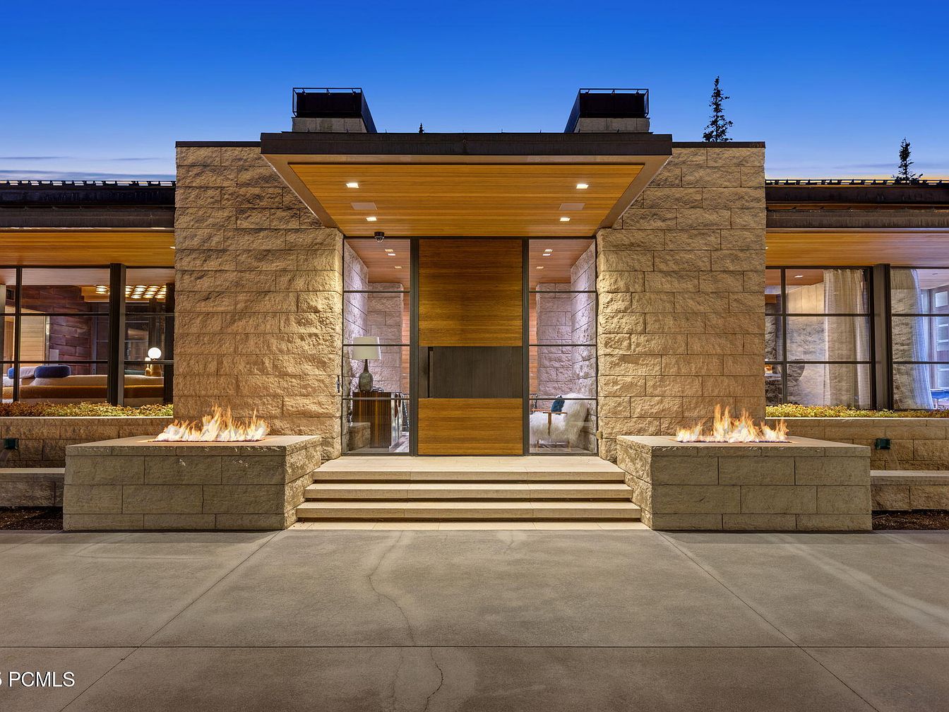 This contemporary entryway blends natural stone and warm wood, creating a striking first impression. The grand entrance features a sleek wooden door framed by expansive glass panels, inviting natural light into the space. Flanking the pathway, stylish fire features add warmth and charm, making it ideal for family gatherings. The neutral color palette harmonizes with the surrounding environment, while subtle architectural details, like the recessed lighting and clean lines, enhance its modern aesthetic. The inviting steps, leading to the entrance, are designed for ease of access, ensuring a welcoming vibe for guests and residents alike.