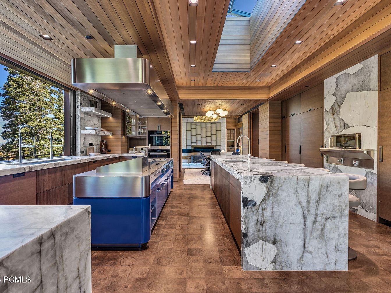 The kitchen features a sleek, spacious layout defined by natural light and high-end materials. The warm wood ceiling complements the polished marble countertops, while contrasting blue cabinetry adds a vibrant touch. State-of-the-art stainless steel appliances seamlessly integrate into the cabinetry, ensuring both functionality and style. Open shelving showcases culinary essentials, blending practicality with aesthetics. Family-friendly features include ample seating at the island and easy access to a scenic outdoor view, promoting gatherings and entertaining. The quiet elegance of this kitchen encourages culinary creativity while offering an inviting atmosphere for family bonding and casual dining.