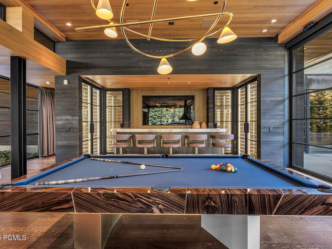 This inviting game room combines luxury with a family-friendly atmosphere. A sleek, modern pool table with a stunning wood finish takes center stage, accentuating the rich, warm tones of the interior. The room features a spacious layout with floor-to-ceiling windows, flooding the area with natural light and offering views of the outdoor landscape. Elegant design elements include a striking chandelier that complements the wooden ceiling, while barstool seating invites relaxation and socializing. The contrasting dark walls enhance the cozy feel, while subtle architectural details, such as polished flooring and stylish decor, create an engaging yet intimate retreat.