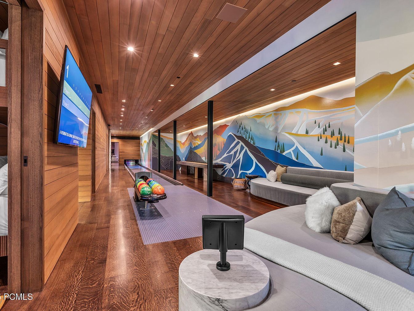 This spacious recreational lounge blends modern elegance with fun-family features. A striking wooden ceiling enhances the warm ambiance, while expansive wall art brings vibrant mountain landscapes to life. Cozy, low-profile seating in soft gray tones invites relaxation, accented by plush throw pillows that add texture and comfort. The designated bowling lane promises lively family gatherings, with colorful bowling balls ready for action. A sleek entertainment area is fitted with a large screen, perfect for movie nights. The overall open layout, combined with rich wooden flooring, creates an inviting atmosphere, ideal for leisure and entertainment.