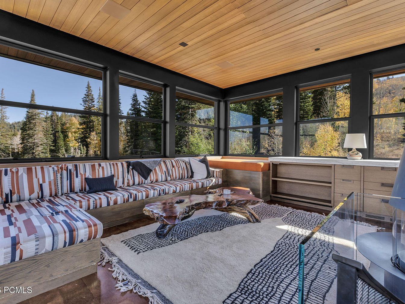 This inviting sunroom combines modern elegance with a touch of nature. A plush, patterned sectional embraces the corner, adorned with accent pillows that complement its vibrant color scheme. Rich wood tones, showcased in the sleek ceiling and custom cabinetry, enhance the warmth of the space while floor-to-ceiling windows invite natural light and stunning views. A unique, organic coffee table adds an artistic flair to the room, perfectly countering the soft textures of the area rug beneath. Family-friendly elements are evident, with ample seating for gatherings and a functional design that encourages relaxation and connection with the serene outdoors.