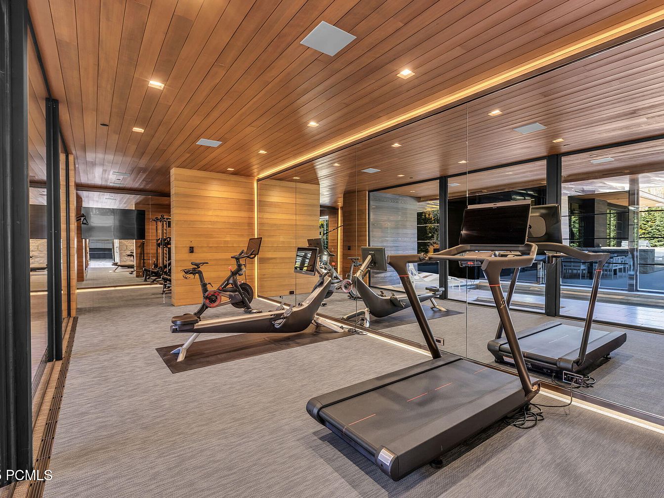 This home gym features a harmonious blend of functionality and modern aesthetics. The spacious layout showcases state-of-the-art fitness equipment anchored by sleek, minimalistic designs. Warm wooden paneling on the ceiling creates an inviting atmosphere while luminous recessed lighting enhances the overall brightness. Mirrored walls expand the sense of space and enable workout monitoring. Plush, gray carpeting underfoot adds comfort, making it a family-friendly area for both exercise and relaxation. Large windows invite natural light and offer views of the outdoor space, blending indoor and outdoor environments seamlessly, perfect for cultivating an active lifestyle.