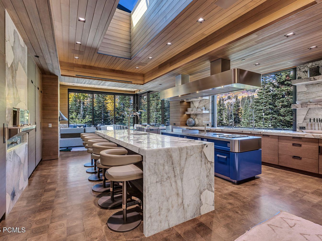 This stunning kitchen combines elegance and functionality with a sleek, modern aesthetic. A spacious island with a striking marble countertop provides ample seating with stylish, circular bar stools, perfect for family gatherings. Light wood cabinetry complements the rich blue kitchen appliances, seamlessly blending contemporary design with warmth. Natural light floods the space through expansive windows, offering breathtaking views of surrounding trees, enhancing the connection with nature. High ceilings adorned with wood give an airy feel, while recessed lighting adds a sophisticated touch. Ideal for cooking and entertaining, this kitchen captures the essence of modern family living.