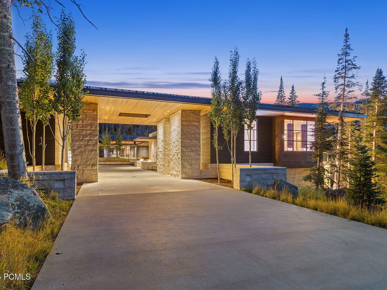 This contemporary American home blends seamlessly with its natural surroundings, showcasing a modern aesthetic. The expansive layout features a flat roof and clean lines, highlighted by the warm glow of exterior lighting at dusk. Stone elements and wood accents create a cozy yet sophisticated appearance. Generous outdoor spaces include a driveway and serene patio areas, perfect for family gatherings or quiet moments. The strategic placement of large windows provides breathtaking views of the surrounding mountains and forests, fostering a connection with nature while inviting plenty of natural light into the home. Suitable for both relaxation and entertainment.